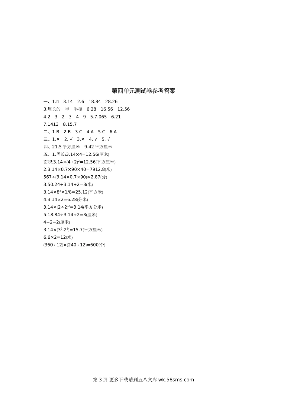第四单元测试卷一、填空题。1.圆的周长总是它的直径的()倍,它是一个无限不循环小数,通常取()。2.一个圆的半径是3厘米,直径是()厘米,周长是()厘米,面积是()平方厘米。3.将一个圆沿半径剪开,得到若干个小扇形,然后...