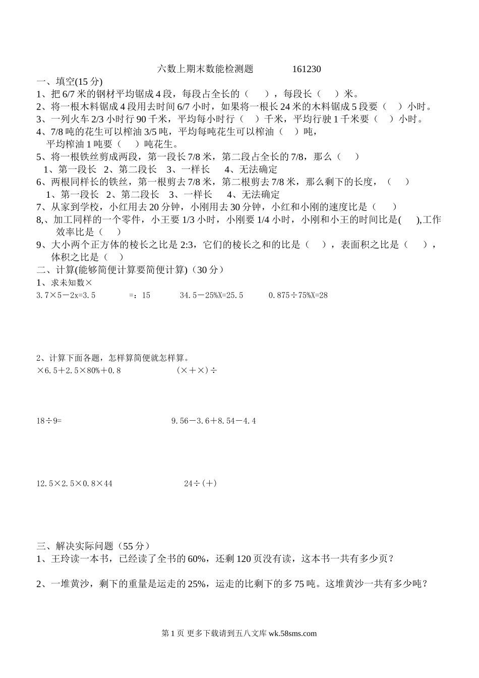 六数上期末数能检测题161230一、填空(15分)1、把6/7米的钢材平均锯成4段,每段占全长的(),每段长()米。2、将一根木料锯成4段用去时间6/7小时,如果将一根长24米的木料锯成5段要()小时。3、一列火车2/3小时...