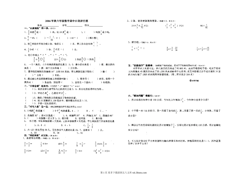 2016年秋人教版小学六年级数学上册期中测试题.doc_第1页