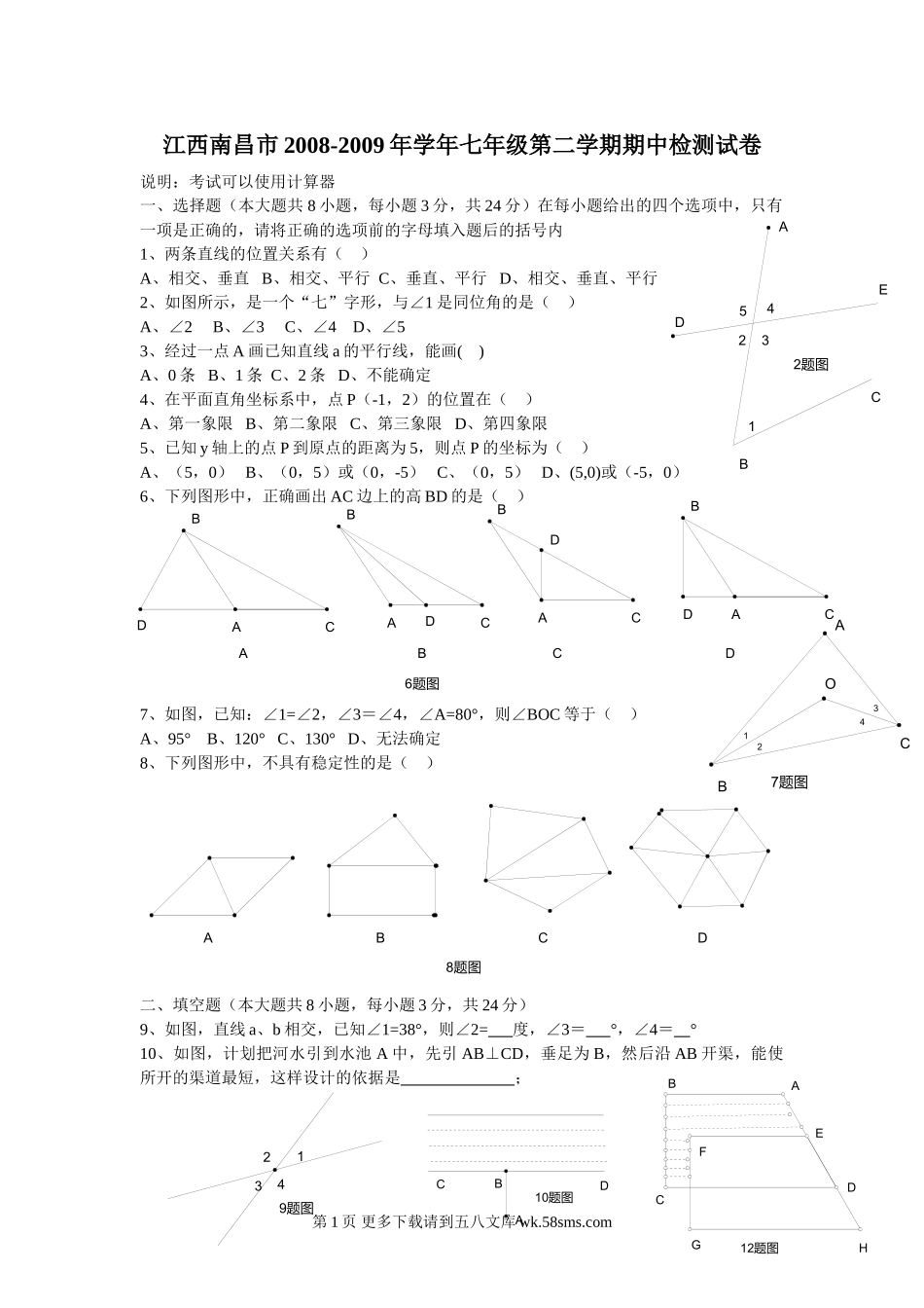 ABCD6题图DDDDABCABCABCCBA8题图ABCD7题图4321OCBA2题图54321EDCBA9题图432112题图HGFEDCBA10题图BADC江西南昌市2008-2009年学年七年级第二学期期中检测试卷说明:考试可以使用计算器一、选择题(本大题共8小题,...