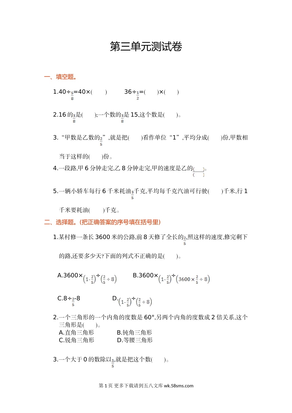 第三单元测试卷一、填空题。1.40÷=40×()36÷=()×()2.16的是();一个数的是15,这个数是()。3.“甲数是乙数的”,就是把()看作单位“1”,平均分成()份,甲数相当于这样的()份。4.一段路,甲6分钟走完,乙8分钟走完,甲...
