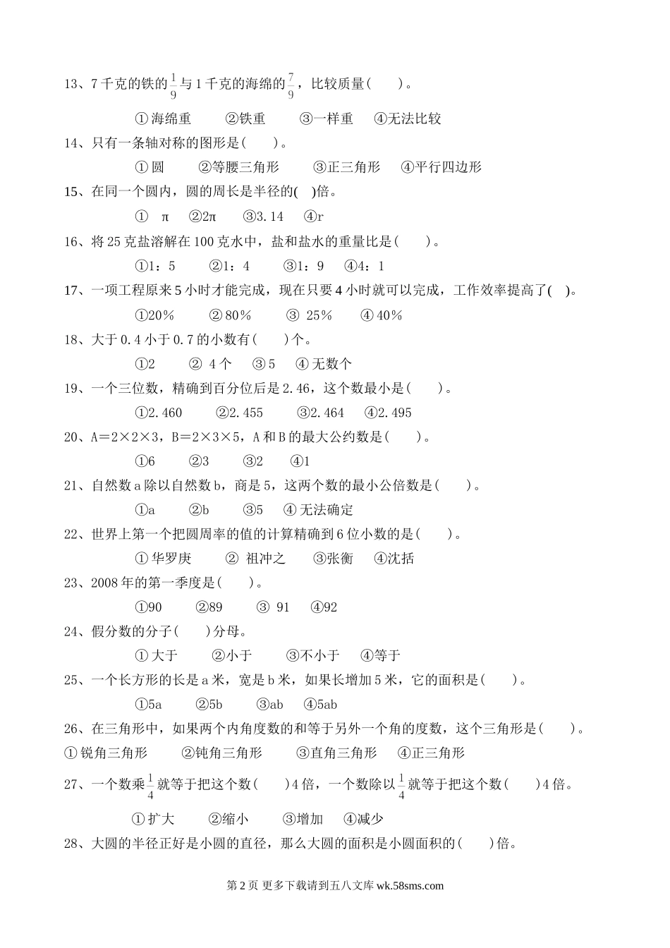 2017年人教版小学六年级数学毕业总复习选择题分类专项练习.doc_第2页
