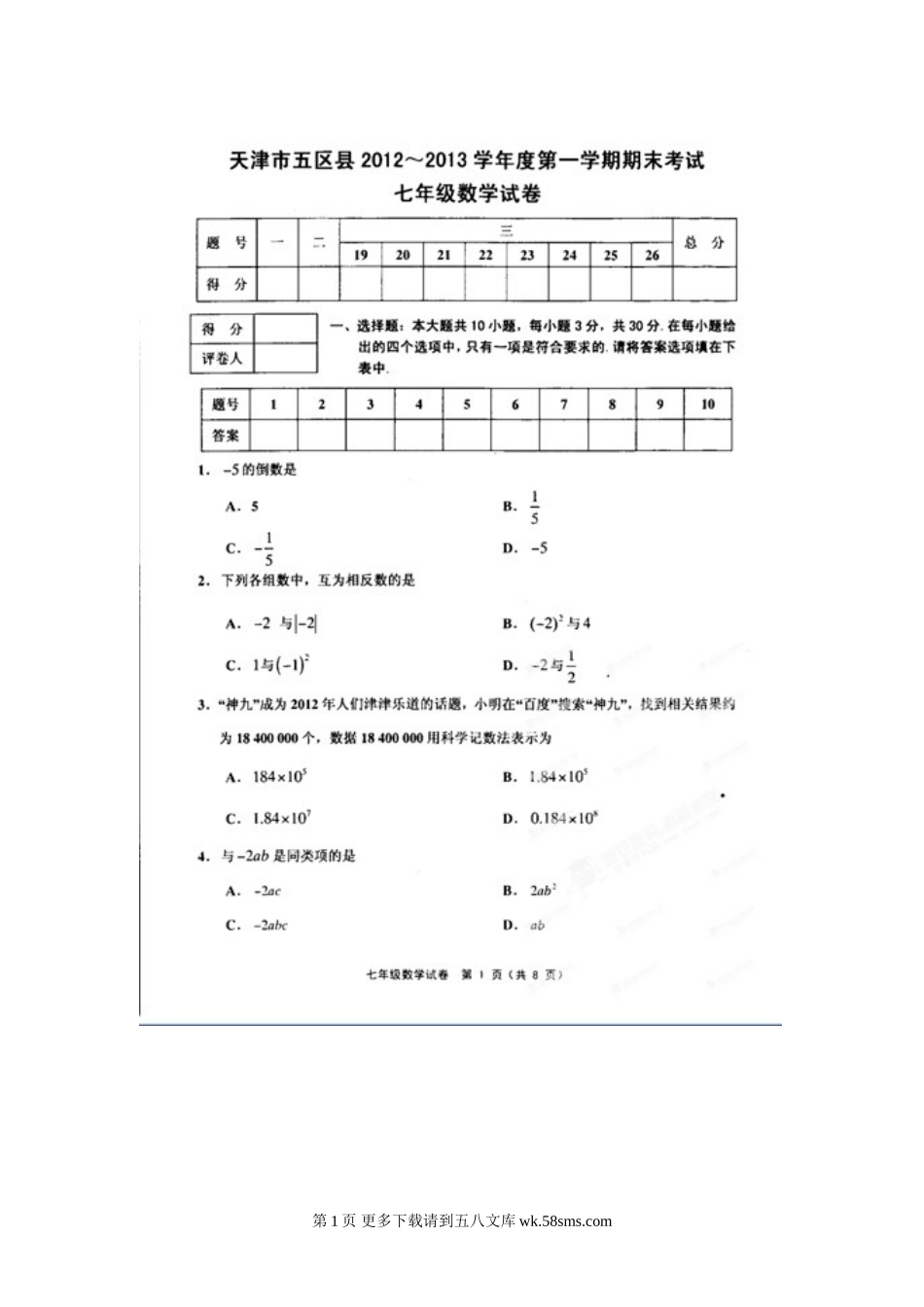 天津市五区县七年级数学期末考试题及答案.doc_第1页