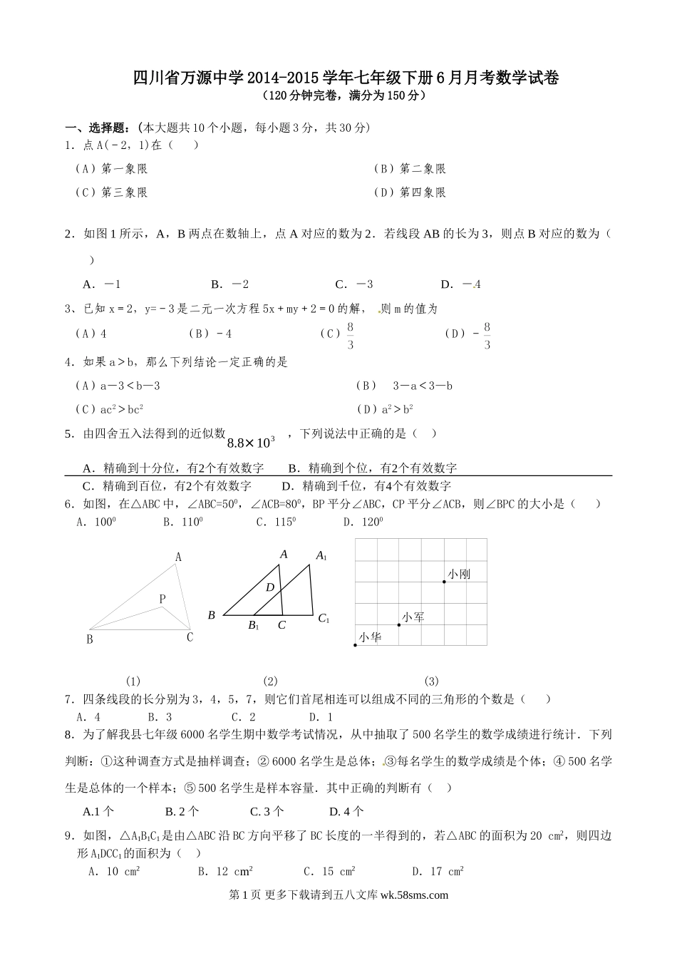 四川省万源中学2014-2015学年七年级下册6月月考数学试卷(120分钟完卷,满分为150分)一、选择题:(本大题共10个小题,每小题3分,共30分)1.点A(-2,1)在()(A)第一象限(B)第二象限(C)第三象限(D)第四...