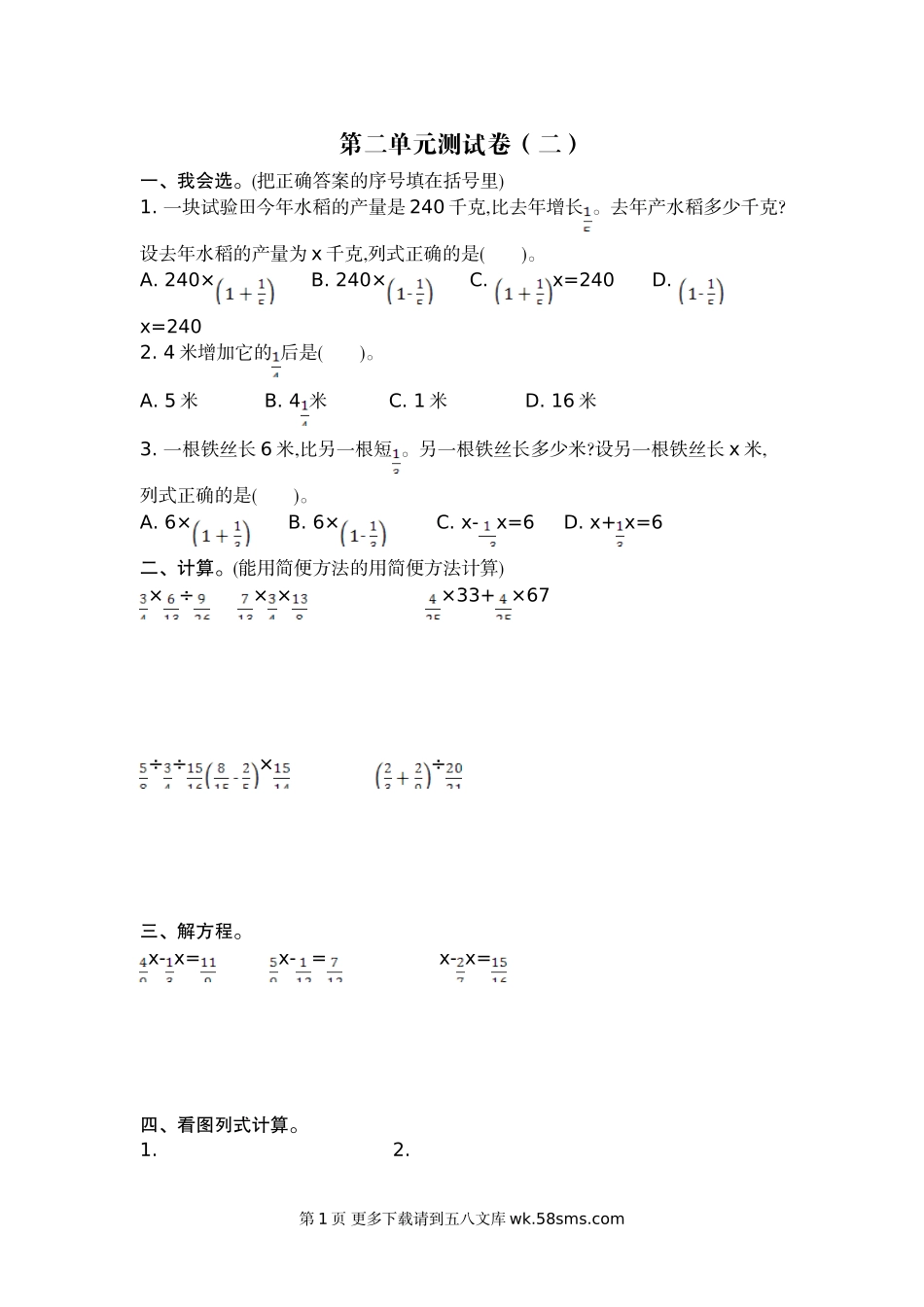 第二单元测试卷(二)一、我会选。(把正确答案的序号填在括号里)1.一块试验田今年水稻的产量是240千克,比去年增长。去年产水稻多少千克?设去年水稻的产量为x千克,列式正确的是()。A.240×B.240×C.x=240D.x=2402....
