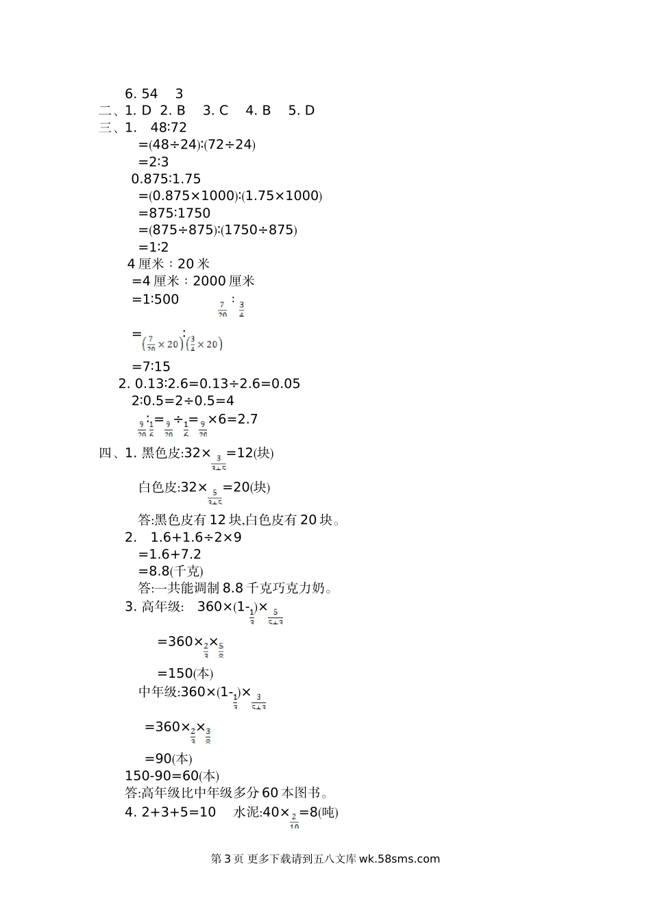 第六单元测试卷(二)一、我会填。1.15÷()=()∶48==()(填小数)2.一辆汽车3时行150千米,这辆汽车所行的路程与时间的比是()︰(),比值是(),这个比值表示()。3.从学校到图书馆,甲用15分,乙用18分,甲、乙所用的时间比...