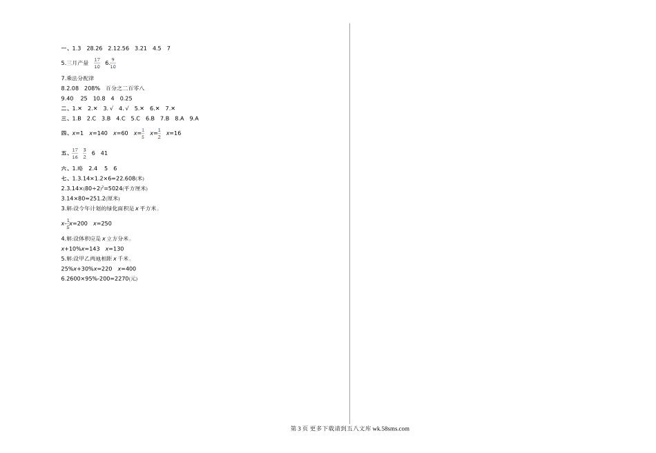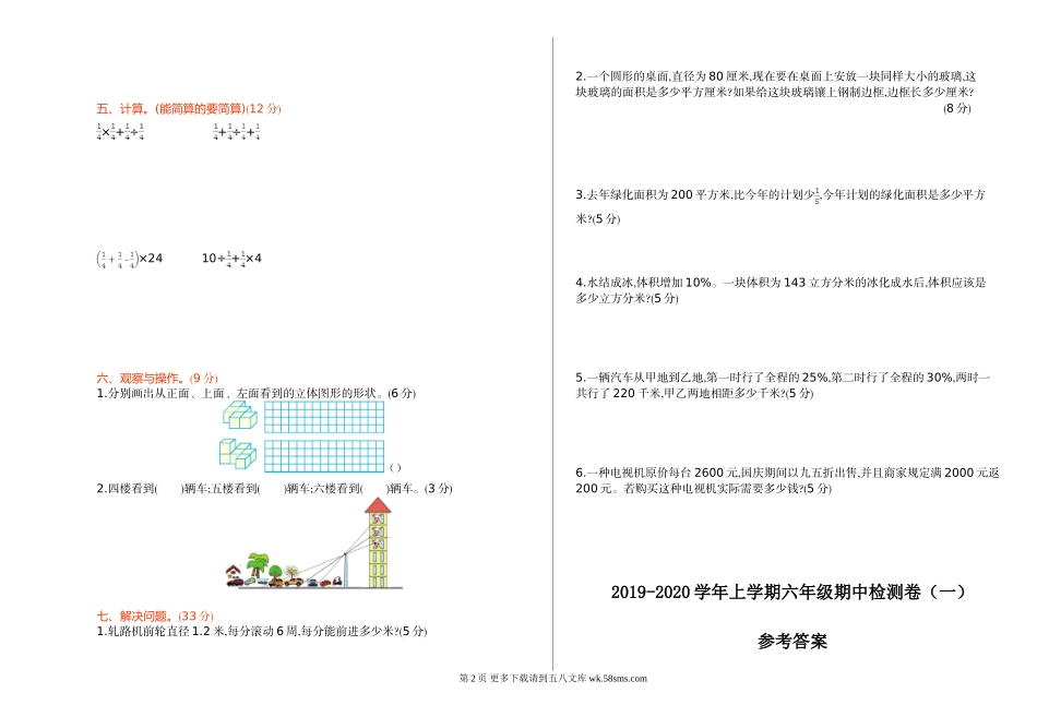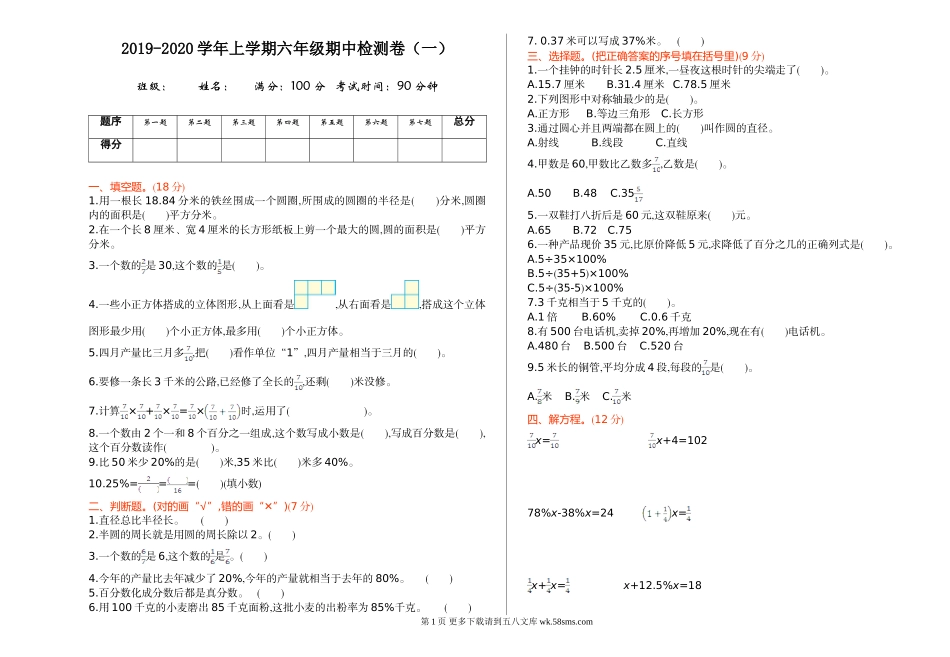 2019-2020学年上学期六年级期中检测卷(一)班级:姓名:满分:100分考试时间:90分钟一、填空题。(18分)1.用一根长18.84分米的铁丝围成一个圆圈,所围成的圆圈的半径是()分米,圆圈内的面积是()平方分米。2.在一个...