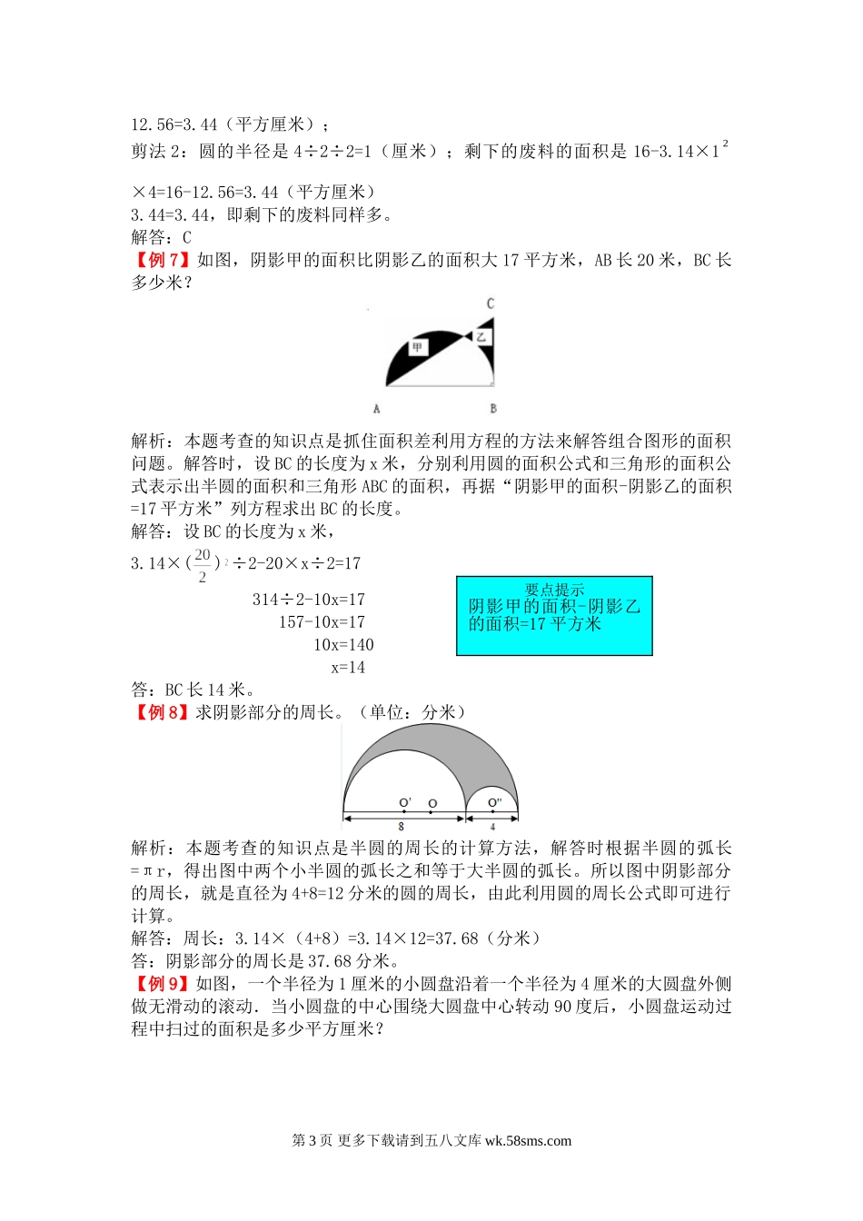 第五单元圆【例1】一个圆的半径增加1厘米,它的周长就增加()。A.1厘米B.2厘米C.6.28厘米D.3.14厘米解析:本题考查的知识点是圆的半径变化引起圆的周长变化的规律。解答时,根据圆的周长公式为计算出圆的半径增...