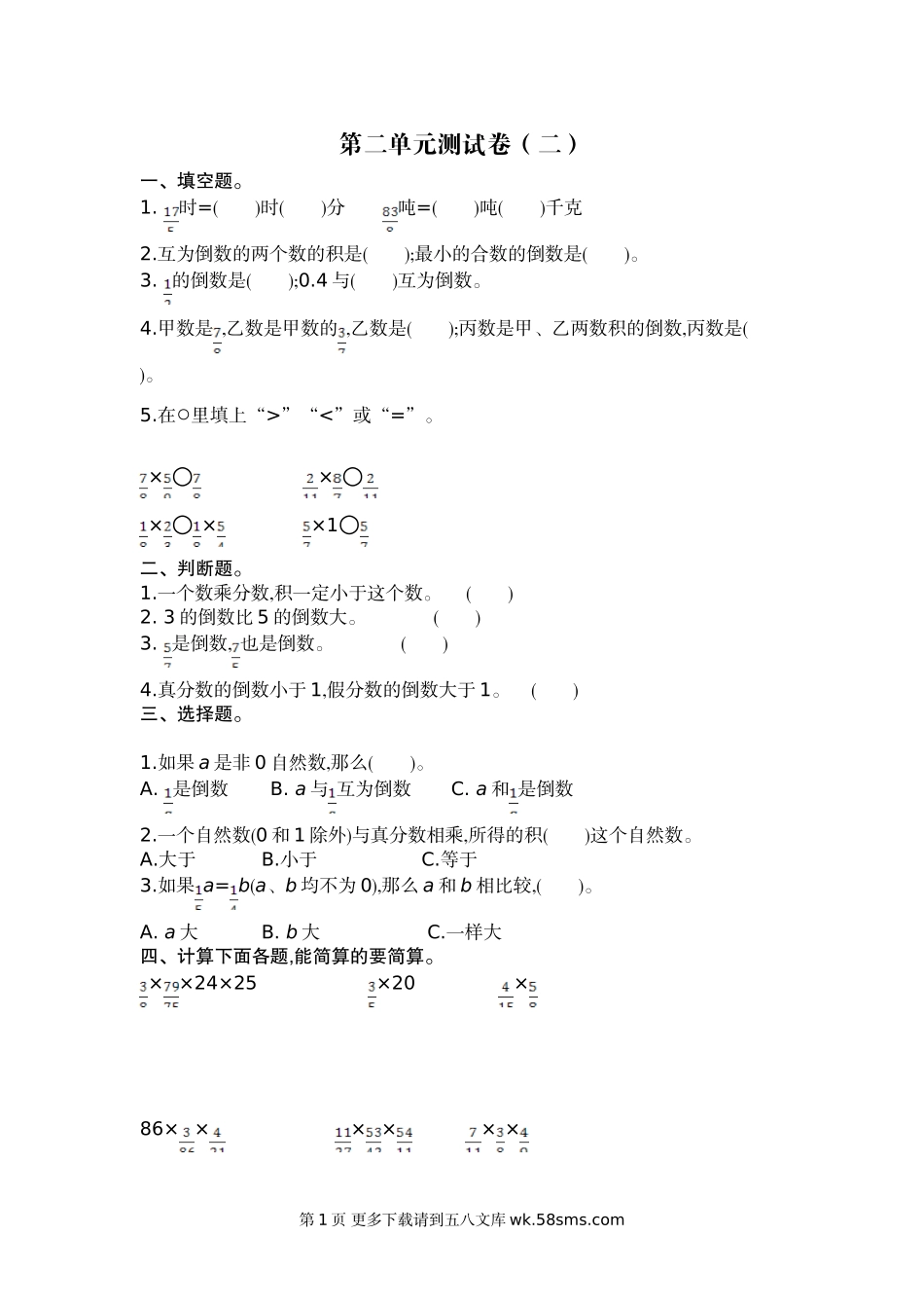 第二单元测试卷(二)一、填空题。1.时=()时()分吨=()吨()千克2.互为倒数的两个数的积是();最小的合数的倒数是()。3.的倒数是();0.4与()互为倒数。4.甲数是,乙数是甲数的,乙数是();丙数是甲、乙两数积的倒数,丙数...