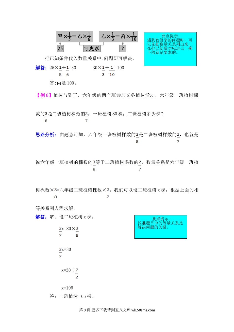 第三单元分数除法【例1】把一根米的木料锯成相等的若干段,一共锯了3次,每段长多少米?思路分析:由题意可知,要将一根木料锯成若干段,锯了3次,要求每段的长度。已知木料的总长度,求每段长,根据每段长=总长...