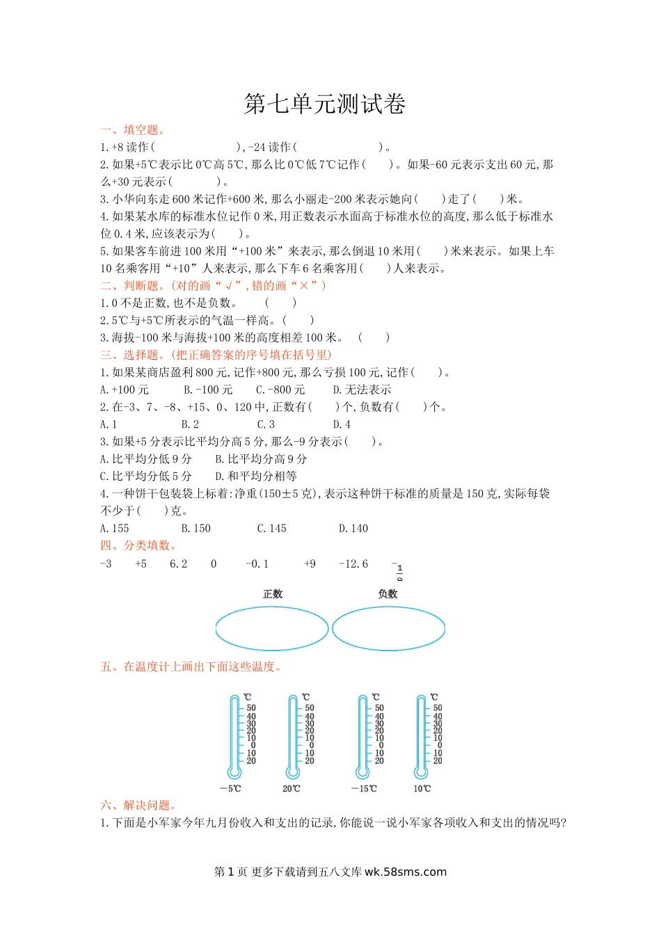 第七单元测试卷一、填空题。1.+8读作(),-24读作()。2.如果+5℃表示比0℃高5℃,那么比0℃低7℃记作()。如果-60元表示支出60元,那么+30元表示()。3.小华向东走600米记作+600米,那么小丽走-200米表示她向()走了()米...