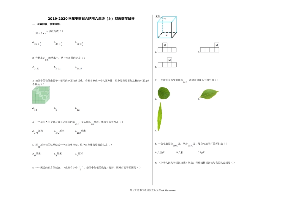 2019-2020学年安徽省合肥市六年级(上)期末数学试卷一、反复比较,慎重选择.1.可以改写成()A.B.C.2.含糖率为的糖水中,糖与水质量的比是()A.B.C.3.如图中的物体由若干个相同的小正方体组成,若把它补成一个...
