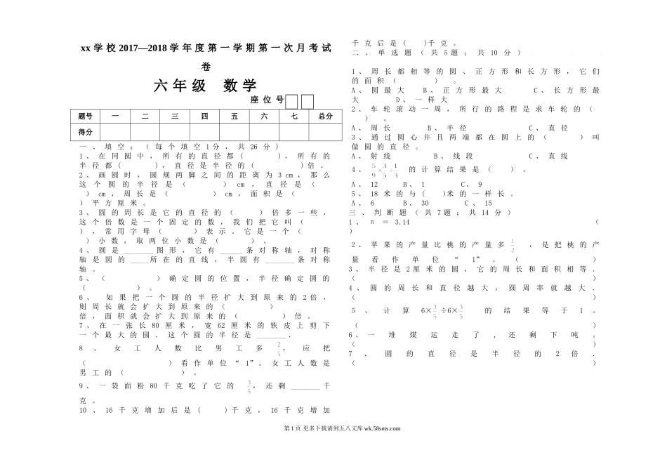 xx学校2017—2018学年度第一学期第一次月考试卷六年级数学座位号:一、填空:(每个填空1分,共26分)1、在同圆中,所有的直径都(),所有的半径都(),直径是半径的()倍。2、画圆时,圆规两脚之间的距离为3cm,那么...
