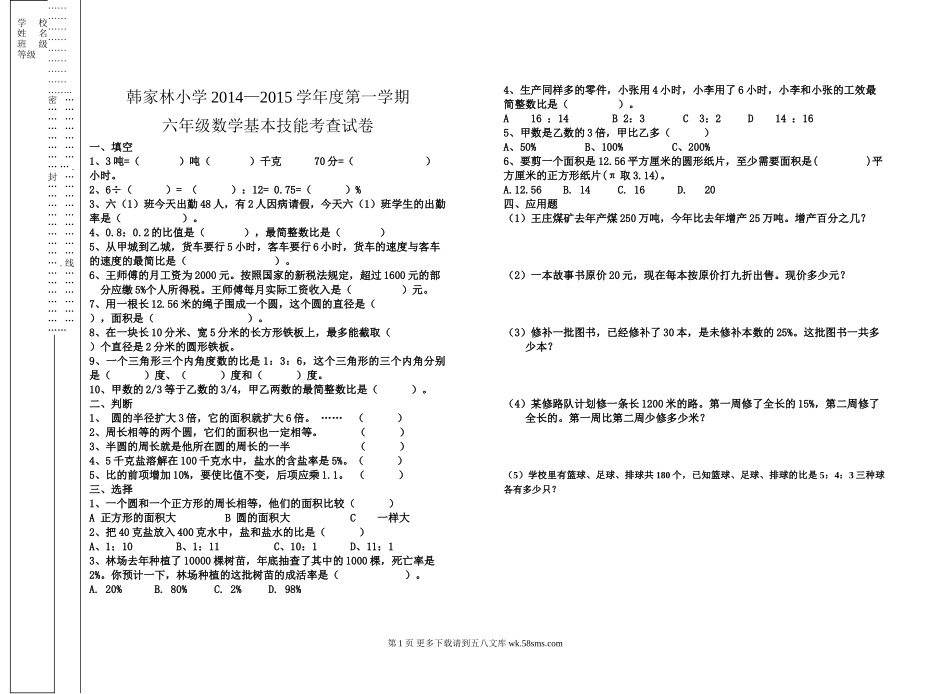 韩家林小学2014—2015学年度第一学期六年级数学基本技能考查试卷一、填空1、3吨=()吨()千克70分=()小时。2、6÷()=():12=0.75=()%3、六(1)班今天出勤48人,有2人因病请假,今天六(1)班学生的出...