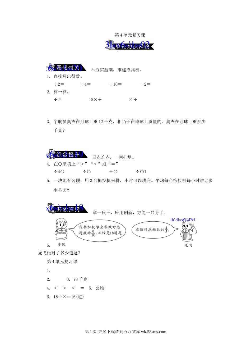 第4单元复习课不夯实基础,难建成高楼。1.直接写出得数。÷2=÷4=÷10=÷2=2.算一算。÷×18×÷×÷3.宇航员奥杰在月球上重12千克,相当于在地球上质量的。奥杰在地球上重多少千克?重点难点,一网打尽。4....