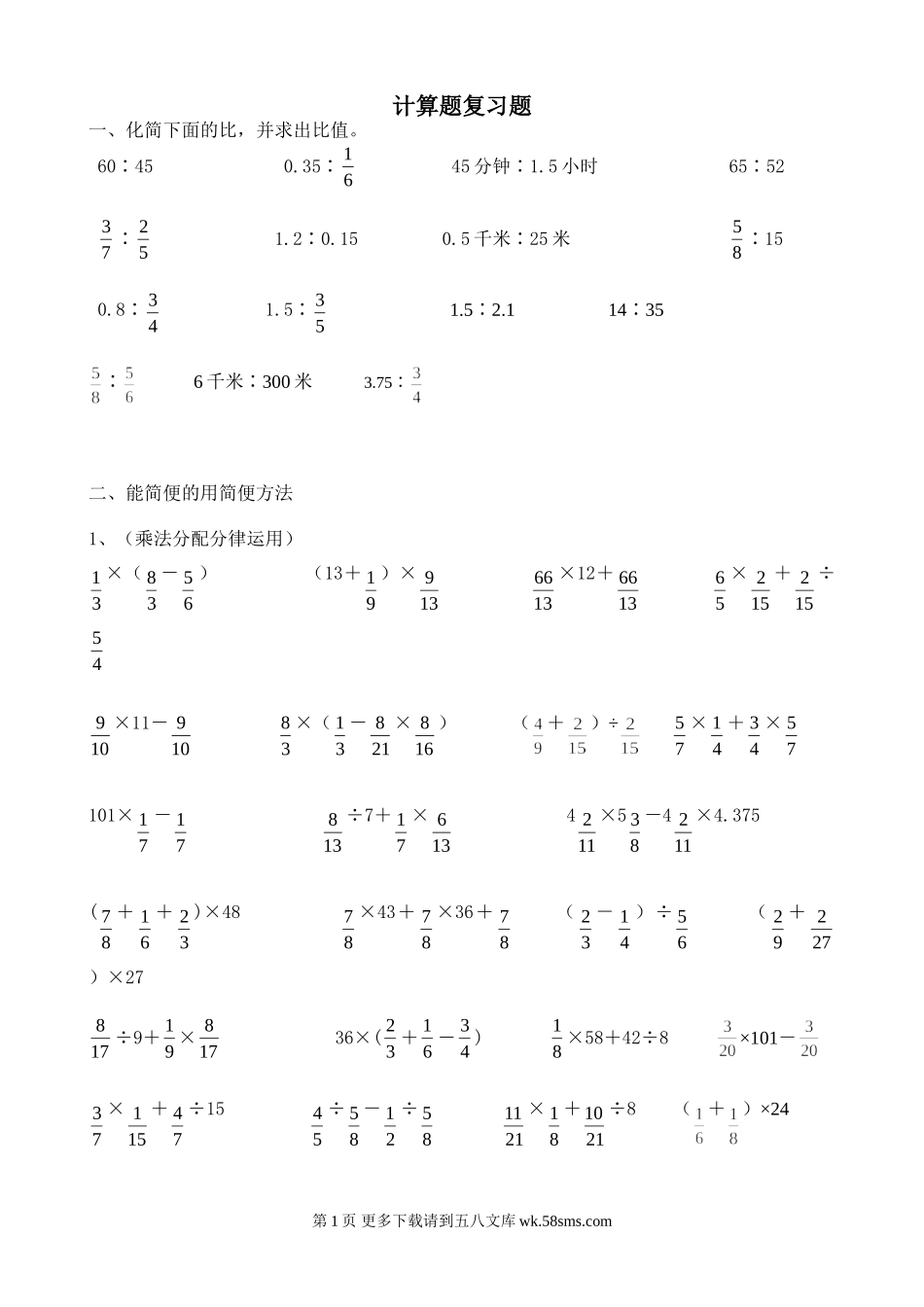 计算题复习题一、化简下面的比,并求出比值。60∶450.35∶6145分钟∶1.5小时65∶5273∶521.2∶0.150.5千米∶25米85∶150.8∶431.5∶531.5∶2.114∶35∶6千米∶300米3.75∶二、能简便的用简便方法1、(乘法分配分...
