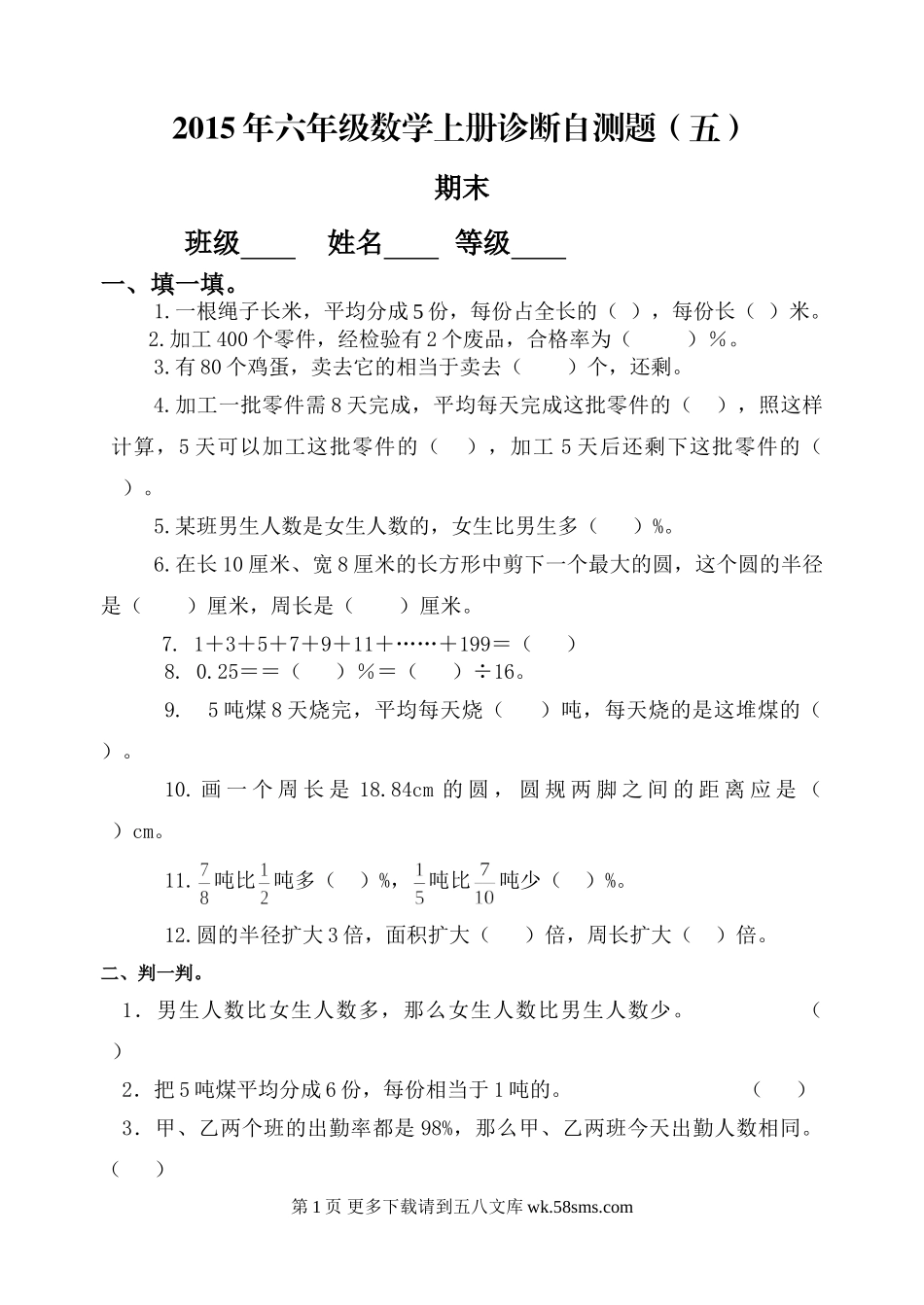 2015年六年级数学上册诊断自测题(五)期末班级姓名等级一、填一填。1.一根绳子长米,平均分成5份,每份占全长的(),每份长()米。2.加工400个零件,经检验有2个废品,合格率为()%。3.有80个鸡蛋,卖去它的...