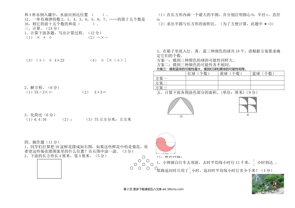 六年级数学质量检测一、选择题1、图中阴影部分长度是米的是()A、B、C、D2、如果★代表一个相同的非零自然数,那么下列各式中,得数最大的是()A、×★B、÷★C、★÷D、★÷3、小明家圆桌直径为1m,现在要给它...