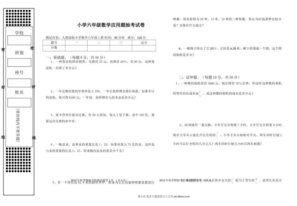 小学六年级数学应用题抽考试卷测试内容:人教版版小学数学六年级上册时间:90分钟满分:120分题号一二三总分分数一:基础题。(每题8分,共48分)1、一种复读机降价销售。先降价25元,再降价20%,卖80元,这种复...