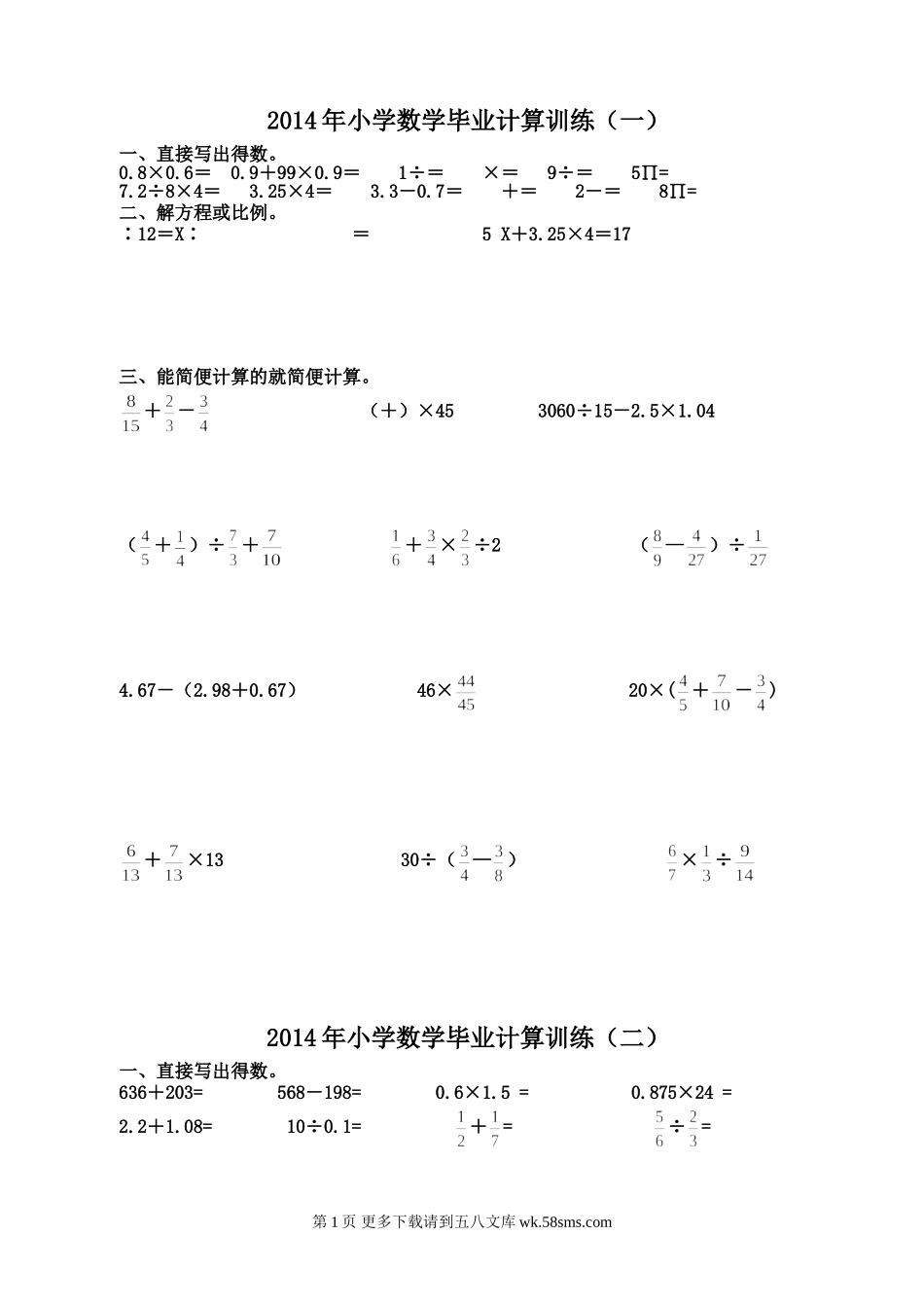 2014年小学数学毕业计算训练(一)一、直接写出得数。0.8×0.6=0.9+99×0.9=1÷=×=9÷=5∏=7.2÷8×4=3.25×4=3.3-0.7=+=2-=8∏=二、解方程或比例。∶12=X∶=5X+3.25×4=17三、能简便计算的就...