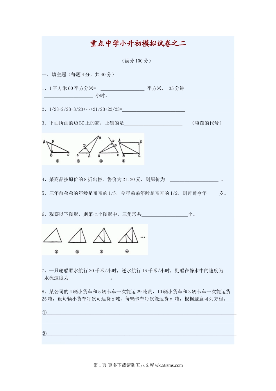 重点中学小升初模拟试卷之二(满分100分)一、填空题(每题4分,共40分)1、1平方米60平方分米=平方米,35分钟=小时。2、1/23+2/23+3/23+…+21/23+22/23=3、下面所画的边BC上的高,正确的是(填图的代号)4、某商...