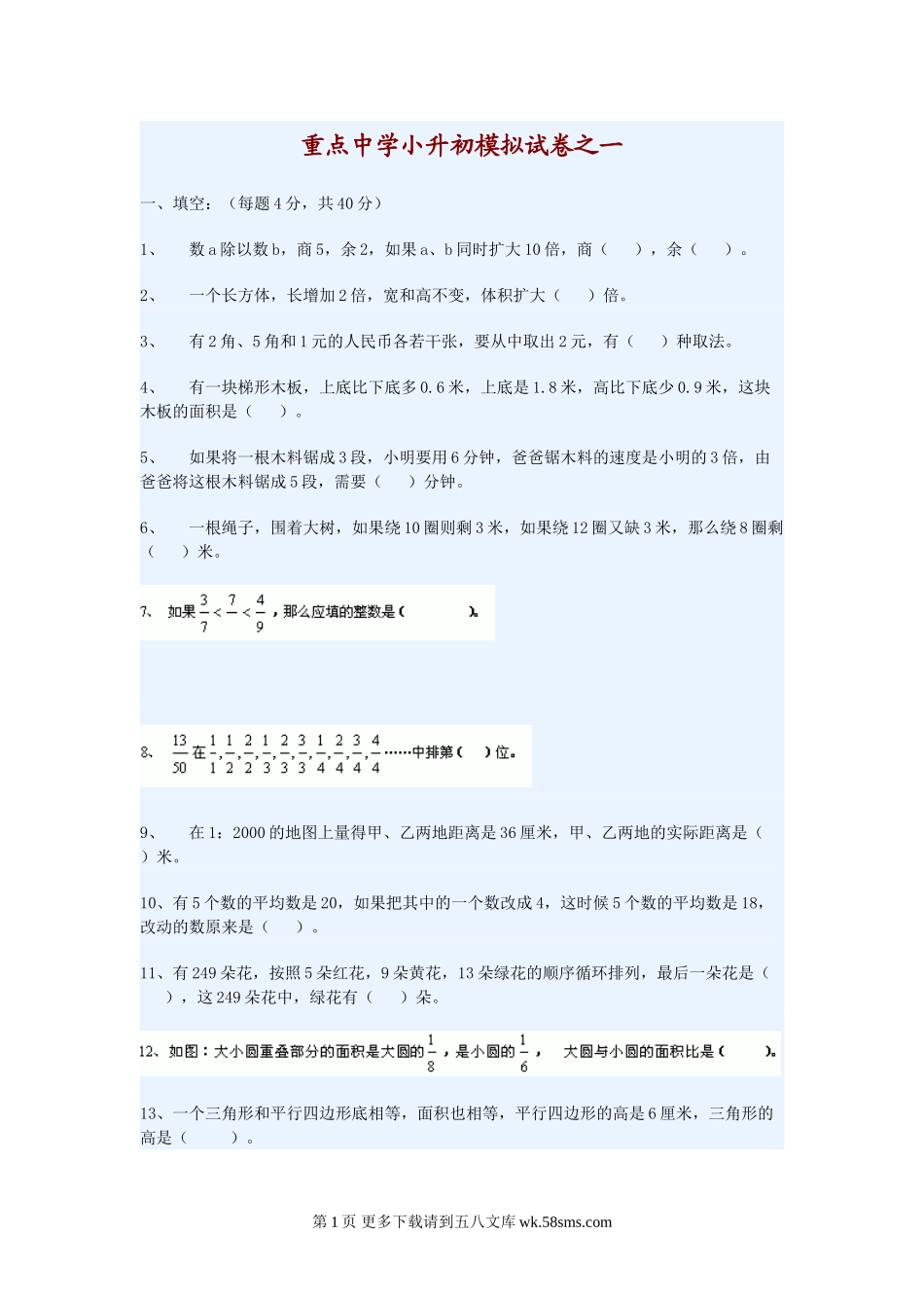 重点中学小升初模拟试卷之一一、填空:(每题4分,共40分)1、数a除以数b,商5,余2,如果a、b同时扩大10倍,商(),余()。2、一个长方体,长增加2倍,宽和高不变,体积扩大()倍。3、有2角、5角和1元的人民...