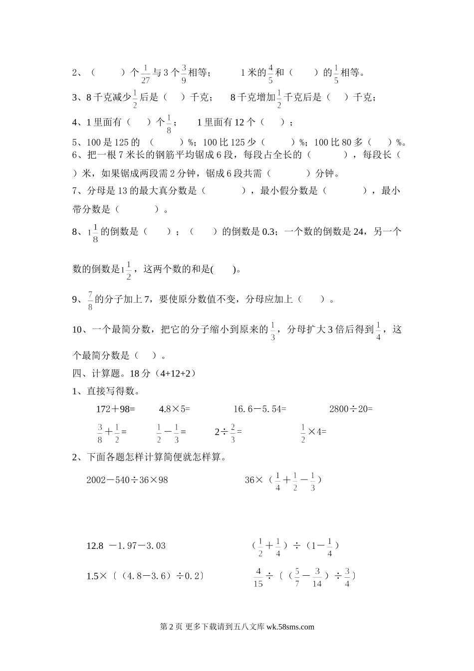 六年级数学总复习题1数与代数与计算.doc_第2页