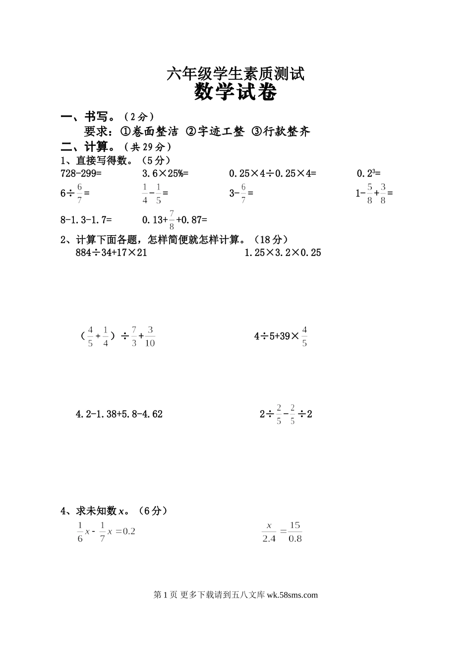 六年级学生素质测试数学试卷一、书写。(2分)要求:①卷面整洁②字迹工整③行款整齐二、计算。(共29分)1、直接写得数。(5分)728-299=3.6×25%=0.25×4÷0.25×4=0.23=6÷=-=3-=1-+=8-1.3-1.7=0.13++0.87=2、...