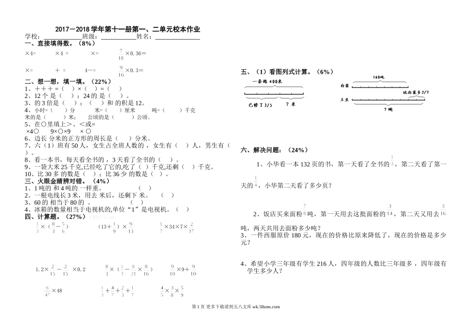 2017-2018学年第十一册第一、二单元校本作业学校:班级:姓名:一、直接填得数。(8%)×4=×4=×=×0.36=×=+=4-=×0.3=二、想一想,填一填。(22%)1、+++=()×()=()2、12个是();24的是()。...