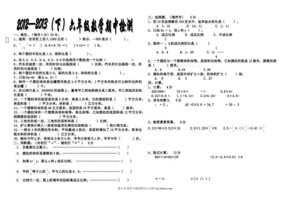 2013.4一、填空。(每空1分)23分。1、通常,在存折上存入1000元用()表示,—800表示()。2、=():0.8=0.75=()÷12=()%。3、两个圆的半径比是1:3,面积比是()。4、在0.2、0.3、0.4、0.5、0.6中选择四...