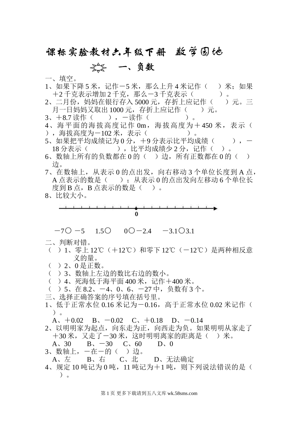 课标实验教材六年级下册数学园地一、负数一、填空。1、如果下降5米,记作-5米,那么上升4米记作()米;如果+2千克表示增加2千克,那么-3千克表示()。2、二月份,妈妈在银行存入5000元,存折上应记作()元...