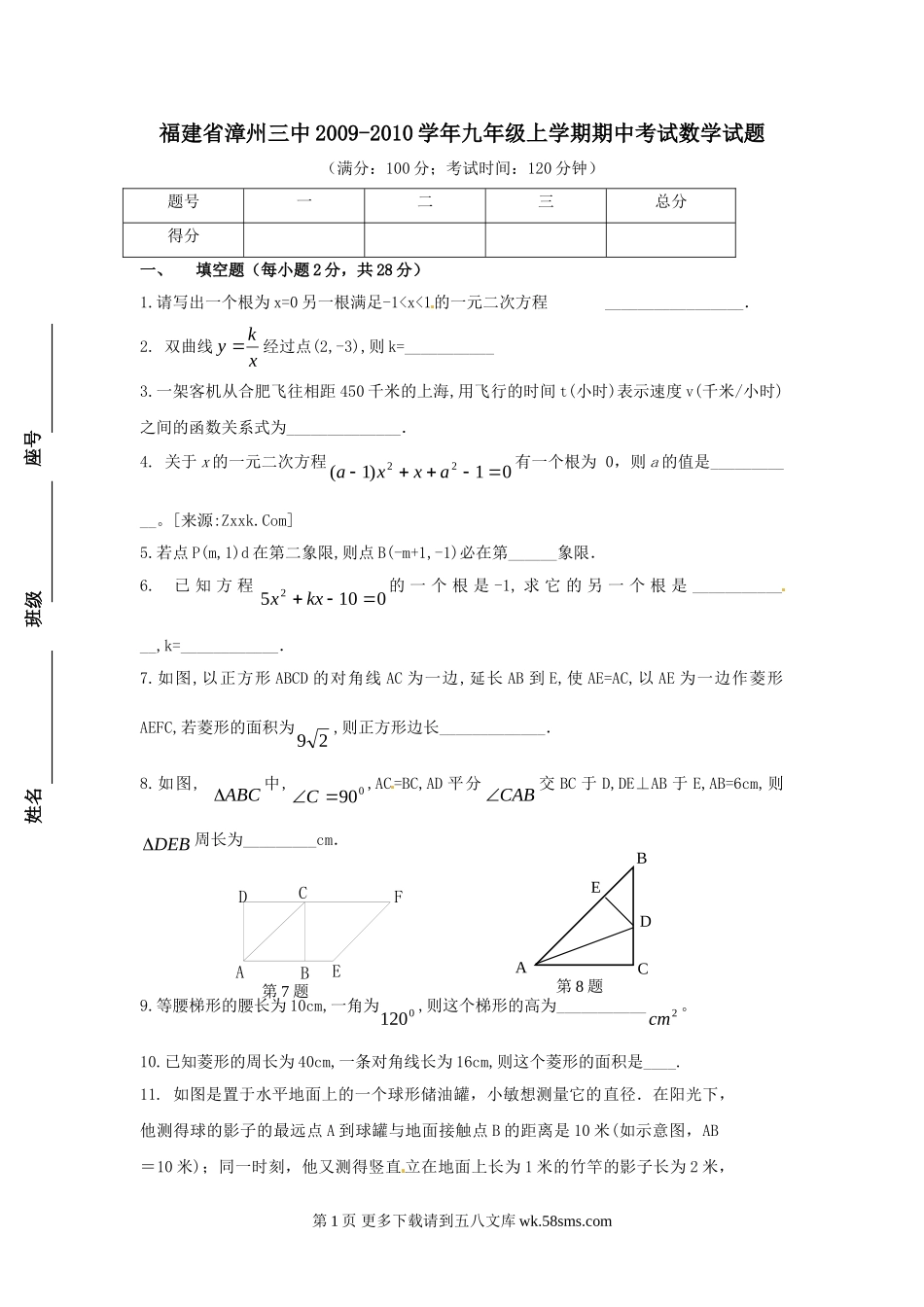 福建省漳州三中2009-2010学年九年级上学期期中考试数学试题(满分:100分;考试时间:120分钟)题号一二三总分得分一、填空题(每小题2分,共28分)1.请写出一个根为x=0另一根满足-1