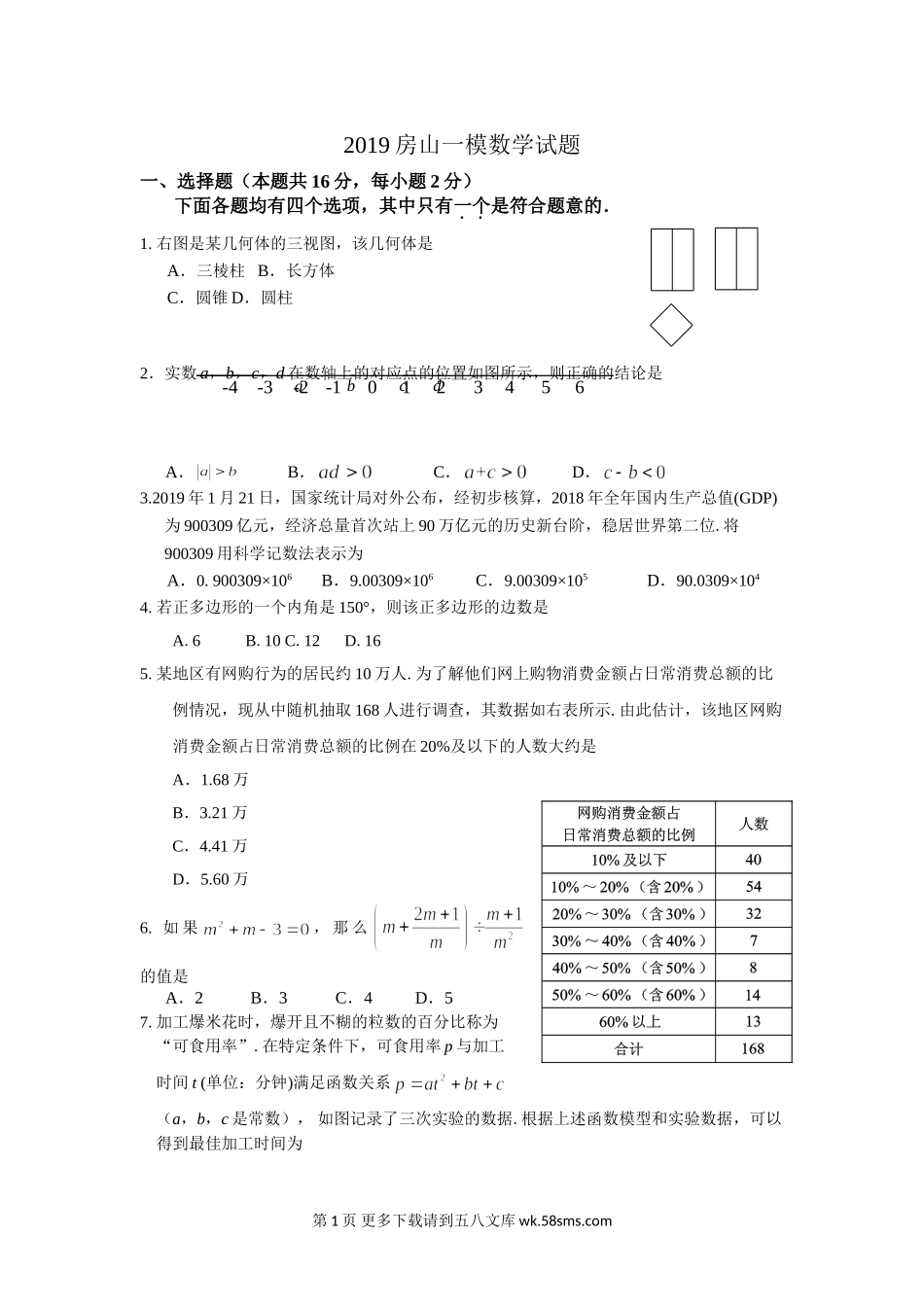 2019房山一模数学试题一、选择题(本题共16分,每小题2分)下面各题均有四个选项,其中只有一个是符合题意的.1.右图是某几何体的三视图,该几何体是A.三棱柱B.长方体C.圆锥D.圆柱2.实数a,b,c,d在数轴上...