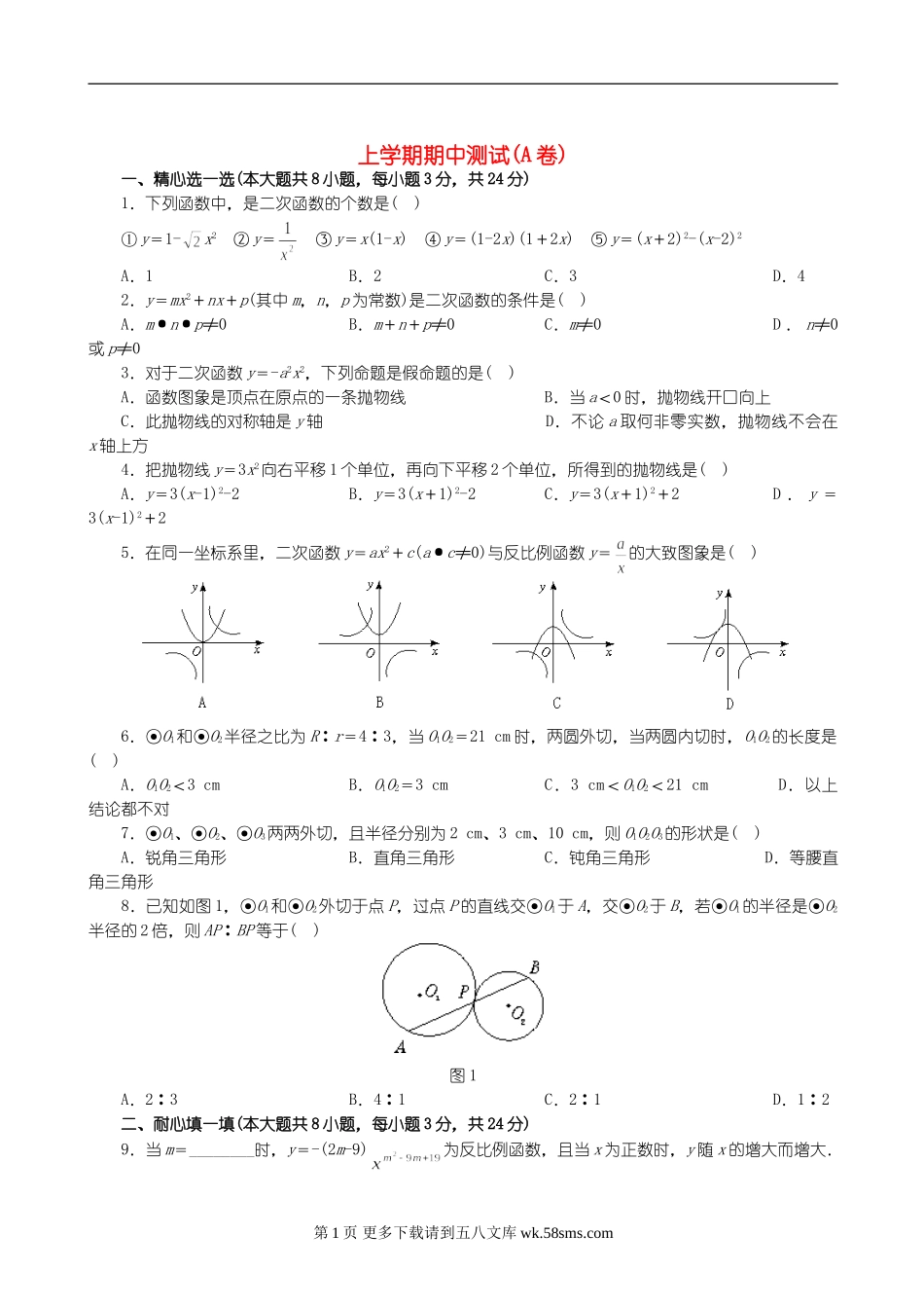 上学期期中测试(A卷)一、精心选一选(本大题共8小题,每小题3分,共24分)1.下列函数中,是二次函数的个数是()①y=1-x2②y=③y=x(1-x)④y=(1-2x)(1+2x)⑤y=(x+2)2-(x-2)2A.1B.2C.3D.42.y=mx2+nx+p(...
