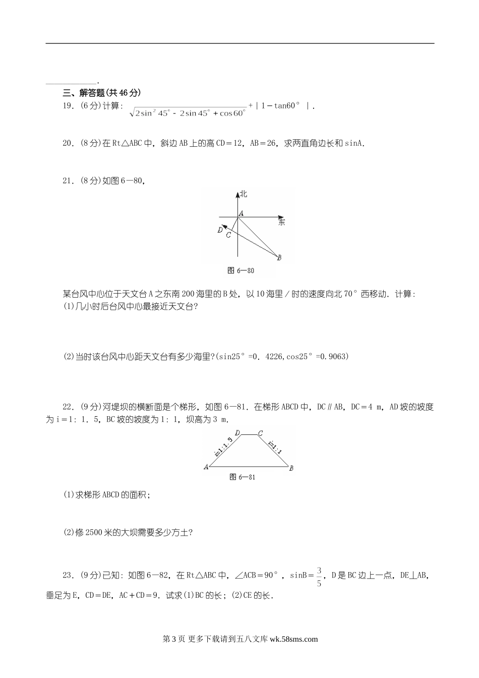 上学期期中复习测试卷(满分100分,时间100分钟)一、选择题(每小题3分,共30分)1.在△ABC中,∠C=90°,若sinA=,则tanB等于A.B.C.D.2.若α、β为锐角,且cosα<cosβ,则下列各式正确的是A.α<β...