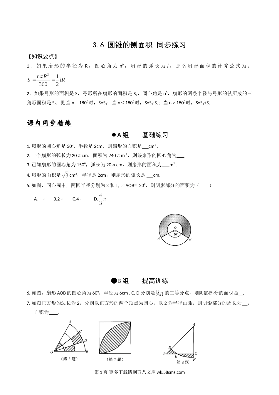 3.6圆锥的侧面积同步练习【知识要点】1.如果扇形的半径为R,圆心角为n0,扇形的弧长为,那么扇形面积的计算公式为:2.如果弓形的面积是S,弓形所在扇形的面积是S1,圆心角是n0,扇形的两条半径与弓形的弦所成的...
