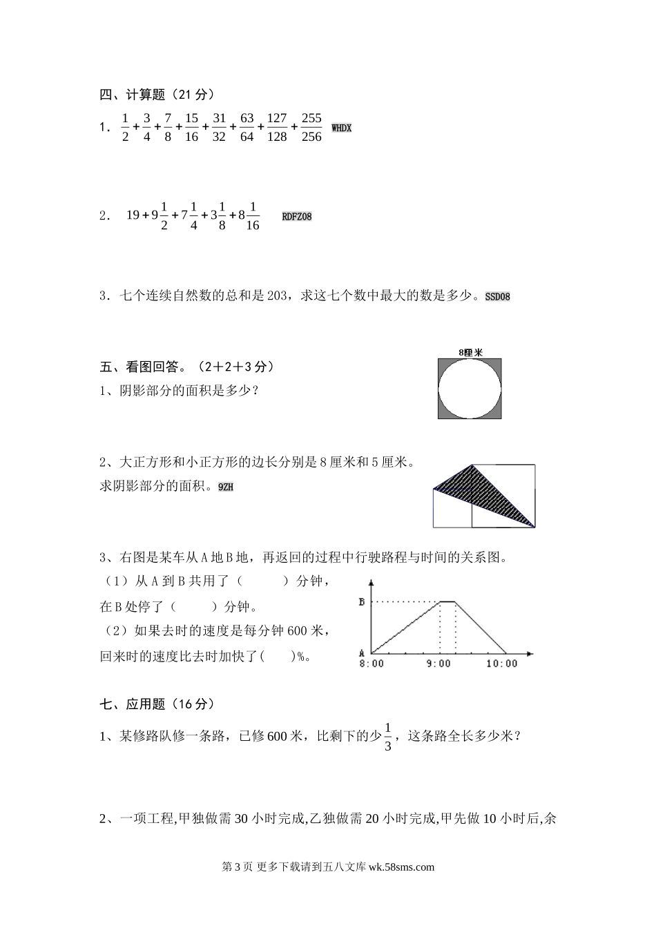 第一部分:基础部分(100分)一、填一填(28分)1、3.2小时=()小时()分54平方米=()平方分米2、把5米长的铁丝平均分成7段,每段是全长的(),每段长()米。3、43=12÷()=()÷12=()%=()折4、比20...