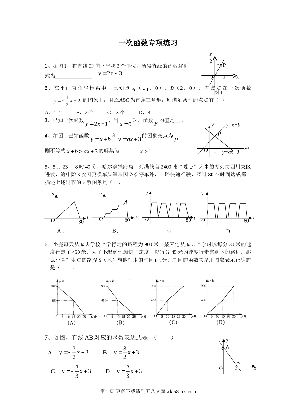 一次函数专项练习1、如图1,将直线OP向下平移3个单位,所得直线的函数解析式为.32xy2、在平面直角坐标系中,已知点A(4,0),B(2,0),若点C在一次函数221xy的图象上,且△ABC为直角三角形,则满...