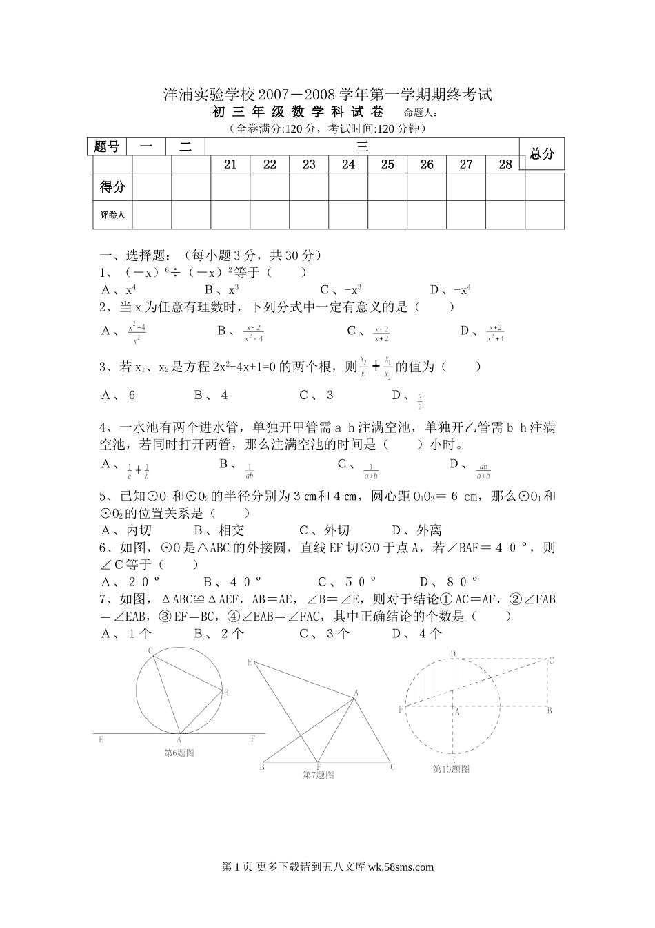 洋浦实验学校2007―2008学年第一学期期终考试初三年级数学科试卷命题人:(全卷满分:120分,考试时间:120分钟)题号一二三总分2122232425262728得分评卷人一、选择题:(每小题3分,共30分)1、(-x)6÷(-x)...