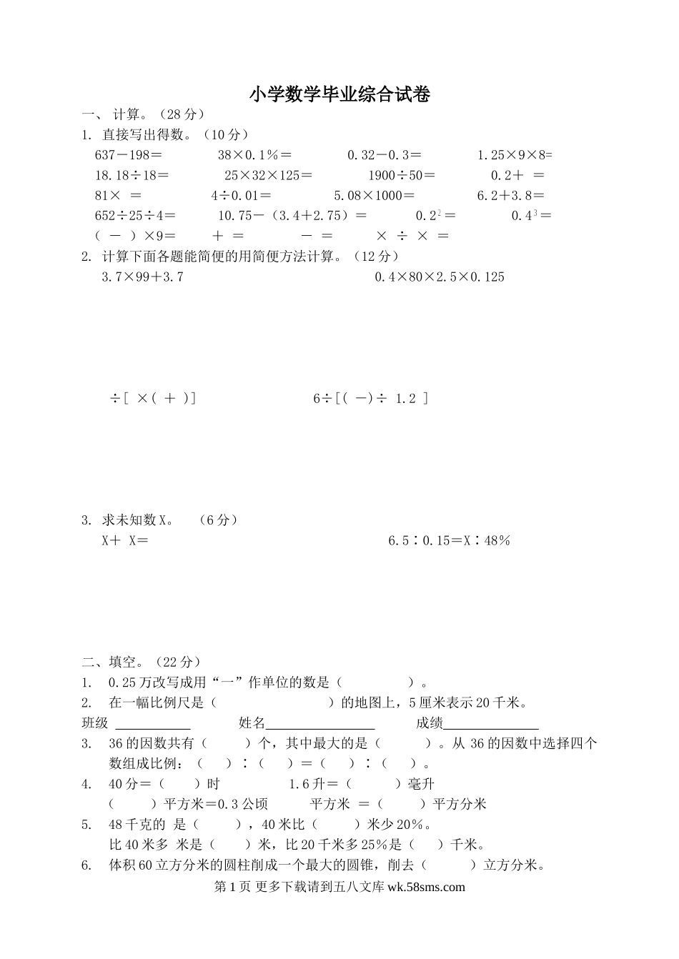小学数学毕业综合试卷一、计算。(28分)1.直接写出得数。(10分)637-198=38×0.1%=0.32-0.3=1.25×9×8=18.18÷18=25×32×125=1900÷50=0.2+=81×=4÷0.01=5.08×1000=6.2+3.8=652÷25÷4=10...