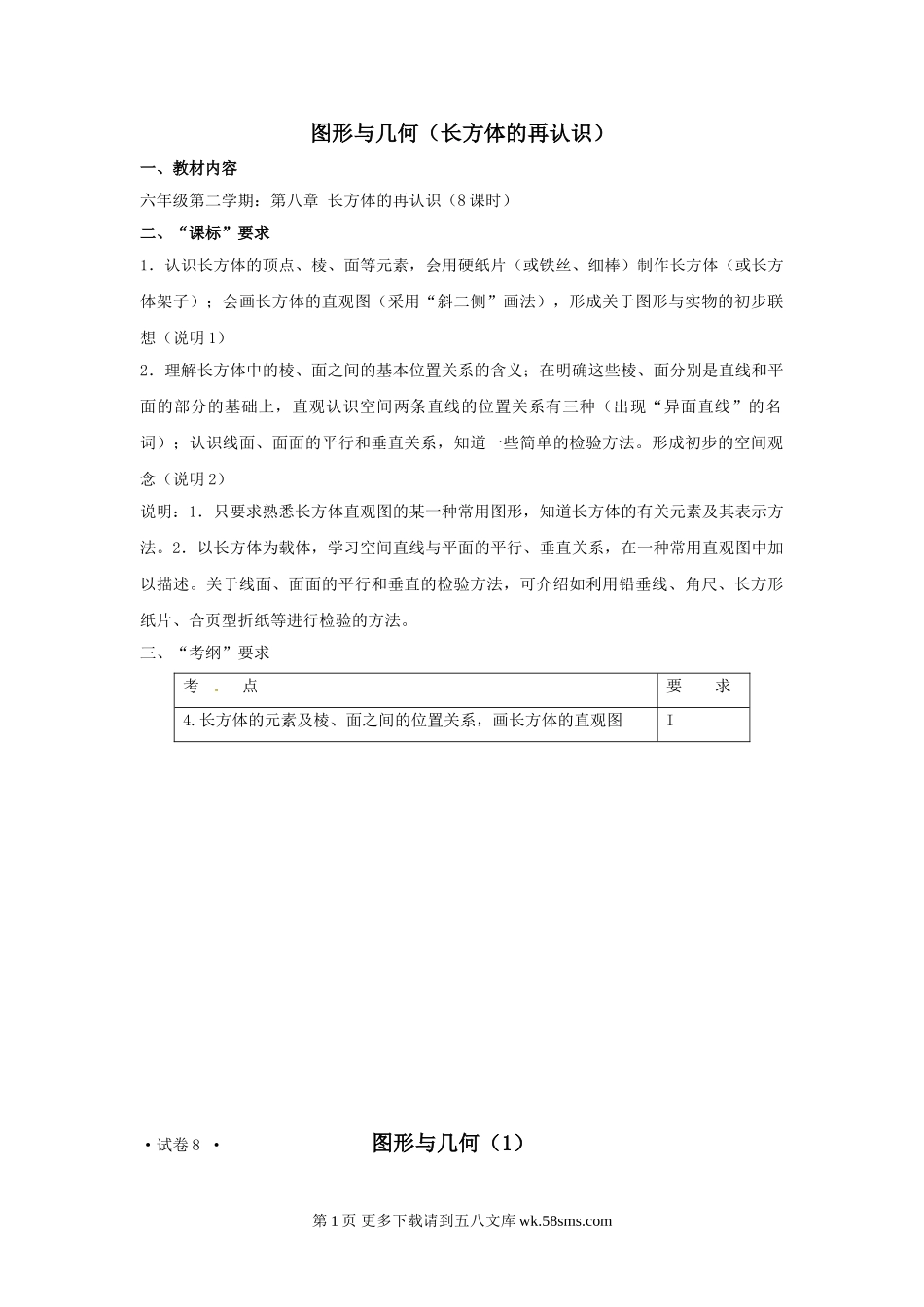图形与几何(长方体的再认识)一、教材内容六年级第二学期:第八章长方体的再认识(8课时)二、“课标”要求1.认识长方体的顶点、棱、面等元素,会用硬纸片(或铁丝、细棒)制作长方体(或长方体架子);会画长...