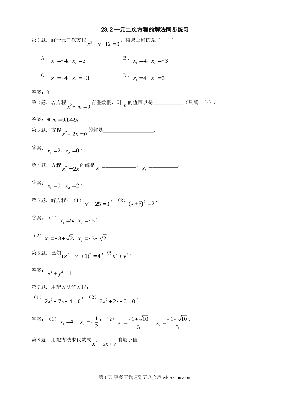 23.2一元二次方程的解法同步练习第1题.解一元二次方程2120xx,结果正确的是()A.1243xx,B.1243xx,C.1243xx,D.1243xx,答案:B第2题.若方程20xm有整数根,则m的值...