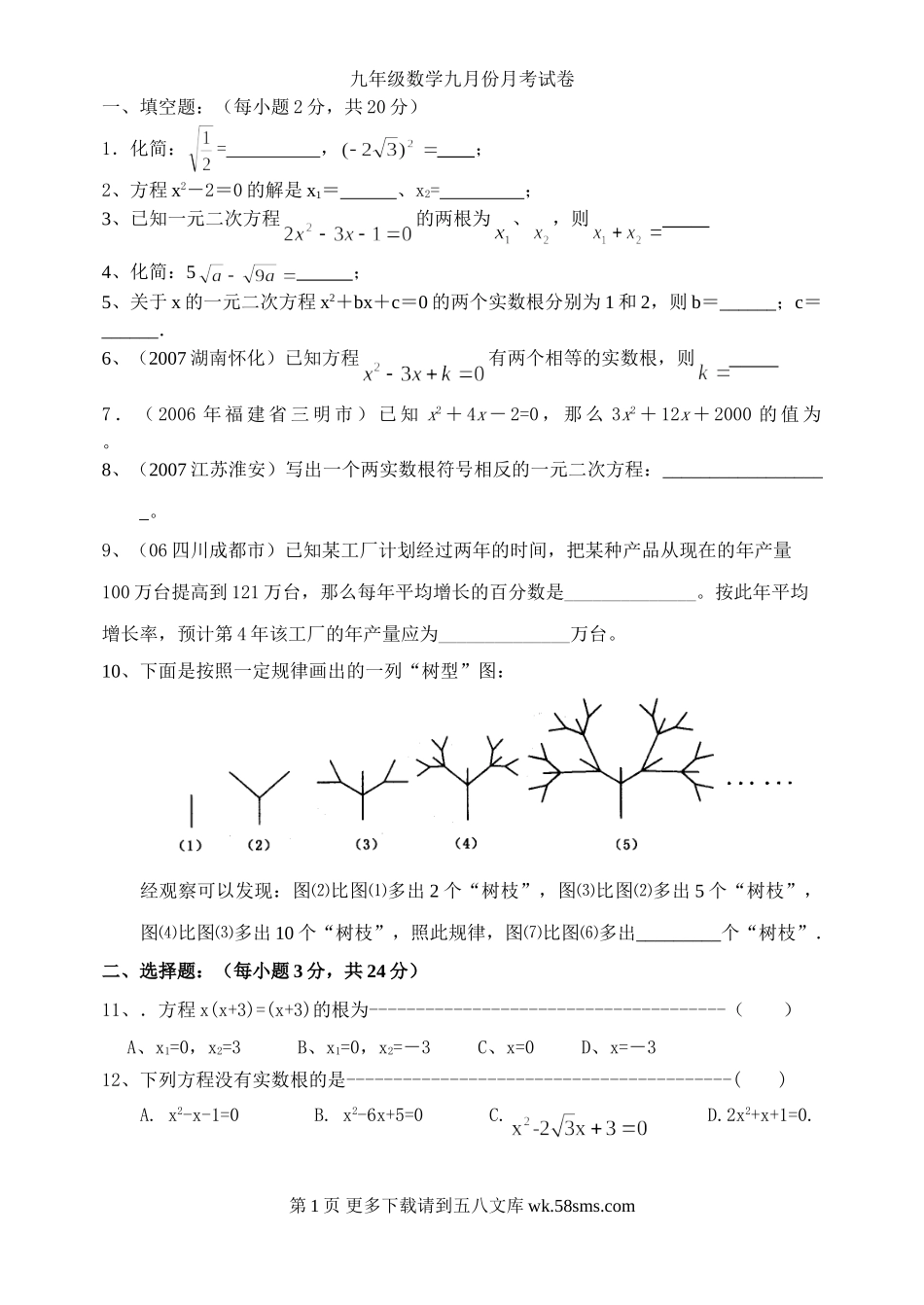 九年级数学九月份月考试卷一、填空题:(每小题2分,共20分)1.化简:=,;2、方程x2-2=0的解是x1=、x2=;3、已知一元二次方程的两根为、,则4、化简:5;5、关于x的一元二次方程x2+bx+c=0的两个实数根分...