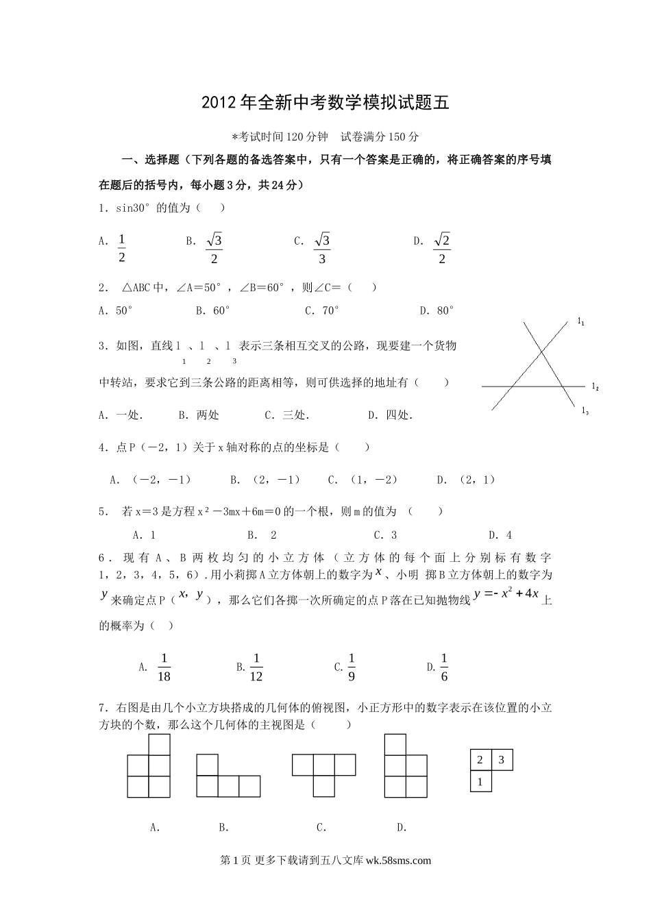 2012年全新中考数学模拟试题五*考试时间120分钟试卷满分150分一、选择题(下列各题的备选答案中,只有一个答案是正确的,将正确答案的序号填在题后的括号内,每小题3分,共24分)1.sin30°的值为()A.21B.23C...