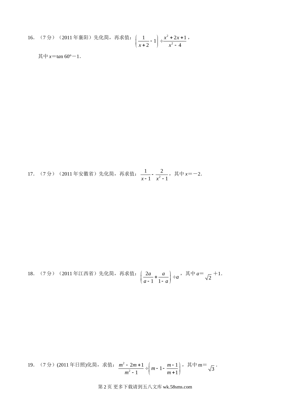 专题三分式(时间:90分钟满分:100分)一、选择题(每小题2分,共8分)1.(2011年菏泽)定义一种运算☆,其规则为a☆b=11ab,根据这个规则计算2☆3的值是()A.56B.15C.5D.62.(2011年威海)计算111mm...