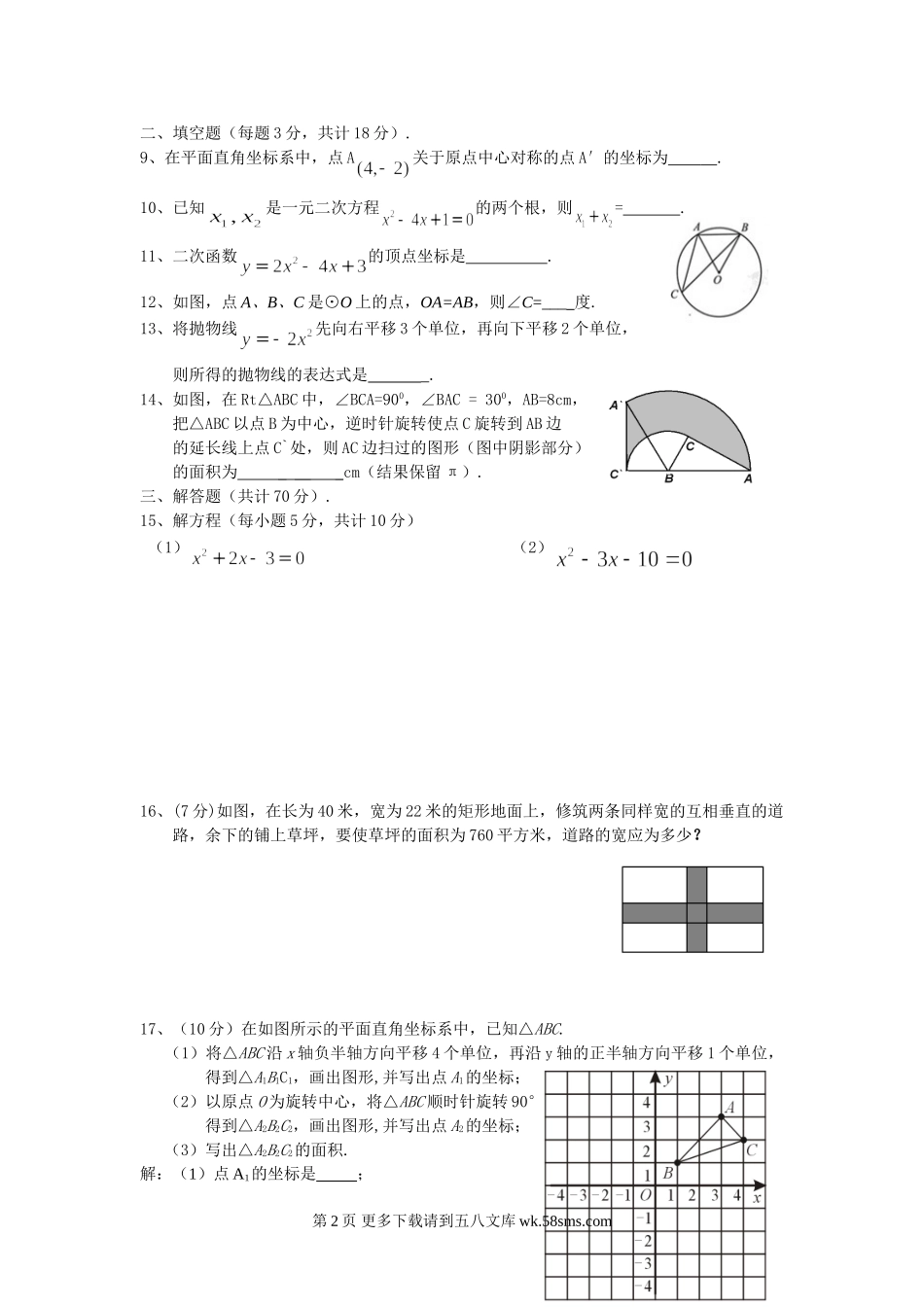 EODCBA2017~2018学年上学期期中考试卷九年级数学(考试时间:120分钟,试卷满分:120)一、选择题(每小题4分,共32分).1、下列方程中,是一元二次方程的是〖〗.A、B、C、D、2、下列图形中,既是中心对称又是轴...