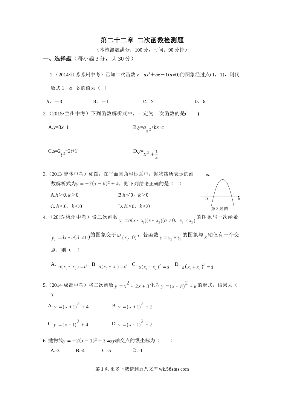 第二十二章二次函数检测题(本检测题满分:100分,时间:90分钟)一、选择题(每小题3分,共30分)1.(2014·江苏苏州中考)已知二次函数y=ax2+bx-1(a≠0)的图象经过点(1,1),则代数式1-a-b的值为()A.-...