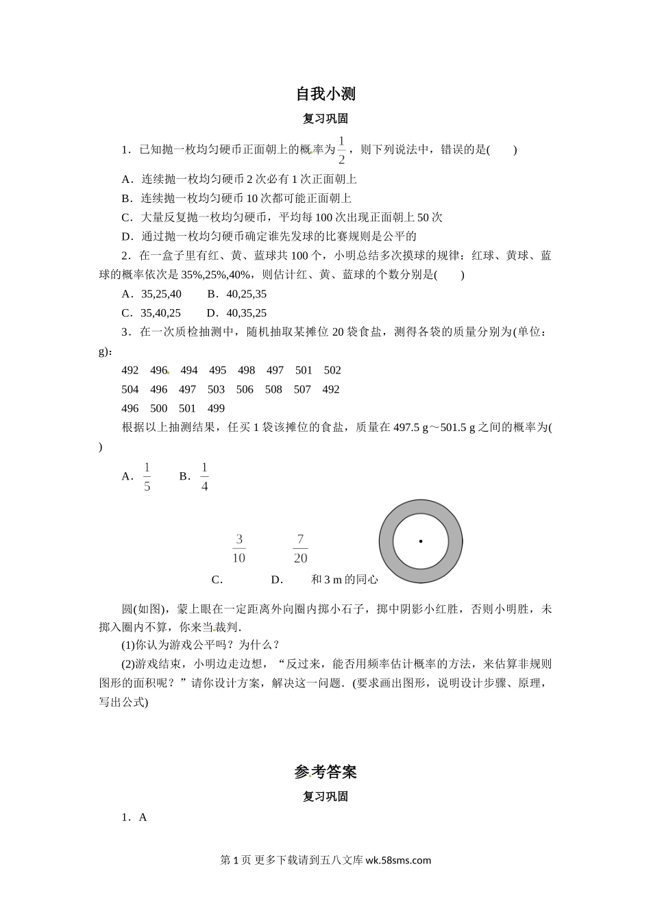 自我小测复习巩固1.已知抛一枚均匀硬币正面朝上的概率为,则下列说法中,错误的是()A.连续抛一枚均匀硬币2次必有1次正面朝上B.连续抛一枚均匀硬币10次都可能正面朝上C.大量反复抛一枚均匀硬币,平均每100次出...