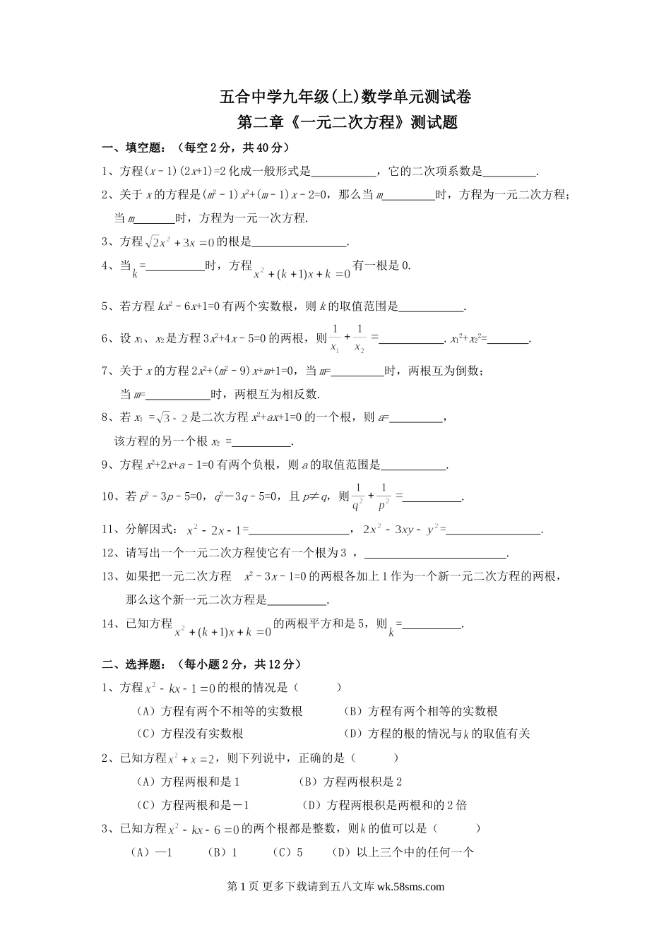 五合中学九年级(上)数学单元测试卷第二章《一元二次方程》测试题一、填空题:(每空2分,共40分)1、方程(x–1)(2x+1)=2化成一般形式是,它的二次项系数是.2、关于x的方程是(m2–1)x2+(m–1)x–2=0,那么当m时,...