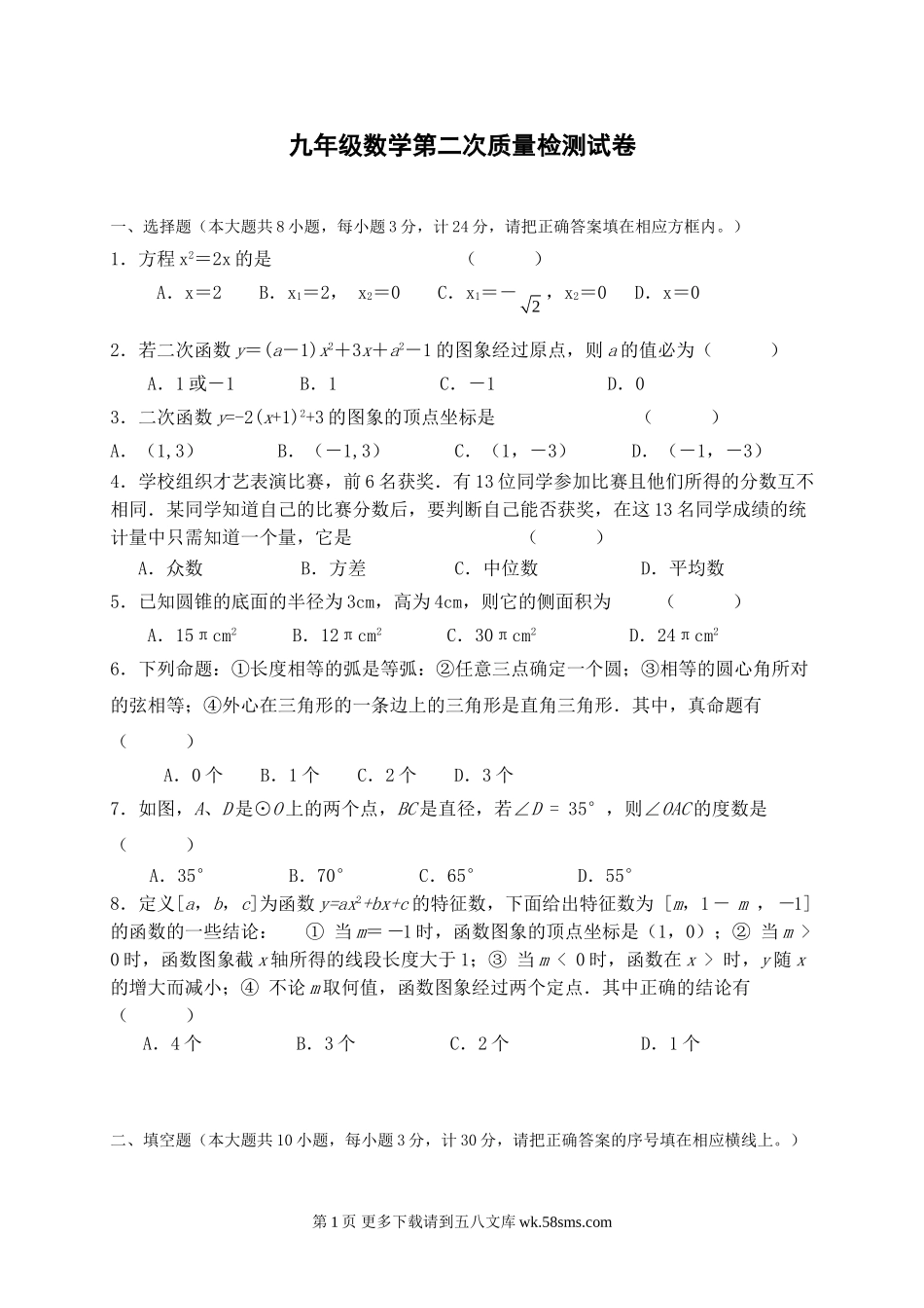 九年级数学第二次质量检测试卷一、选择题(本大题共8小题,每小题3分,计24分,请把正确答案填在相应方框内。)1.方程x2=2x的是()A.x=2B.x1=2,x2=0C.x1=-2,x2=0D.x=02.若二次函数y=(a-1)x2+...